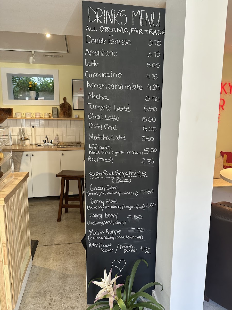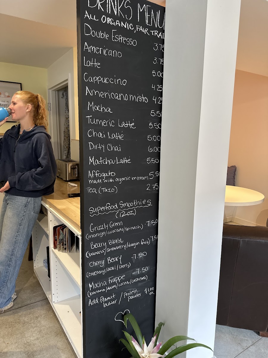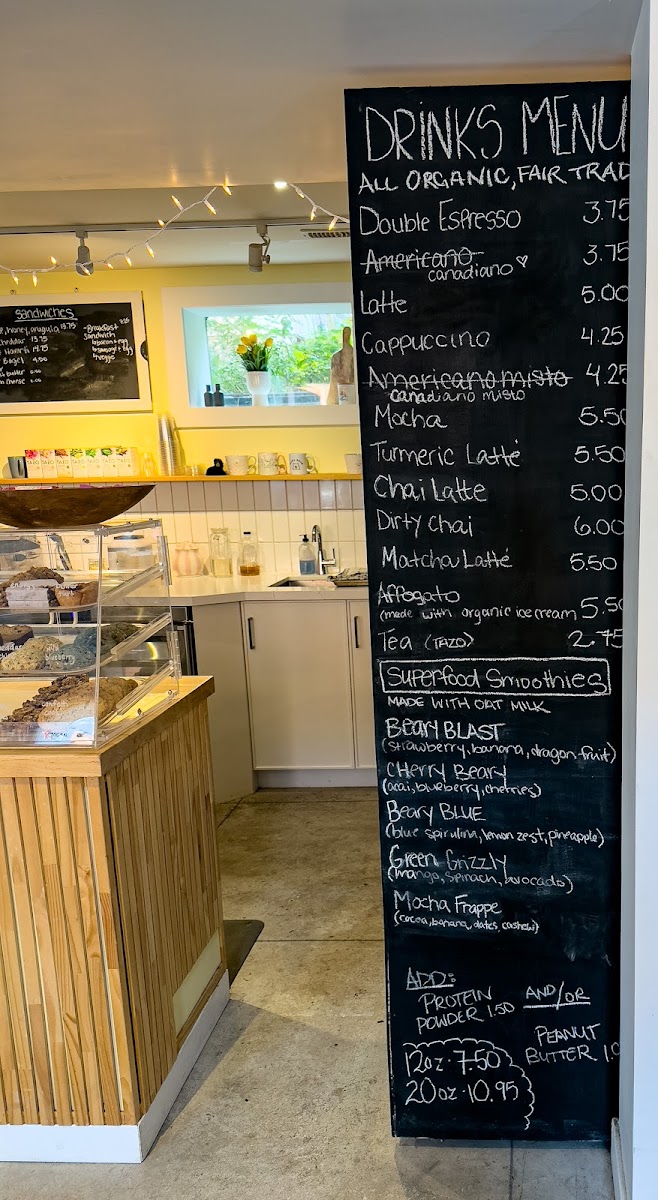 In addition to hot and cold coffee drinks, the cafe serves superfood smoothies, which include options like Grizzly Green, Beary Blast, and Cherry Beary. A mocha frappe is also available for those seeking a chilled coffee experience.